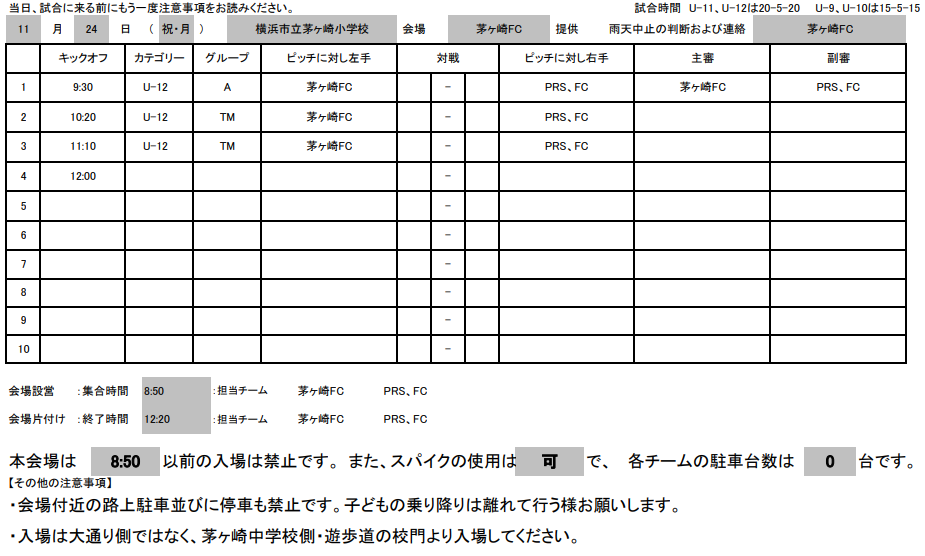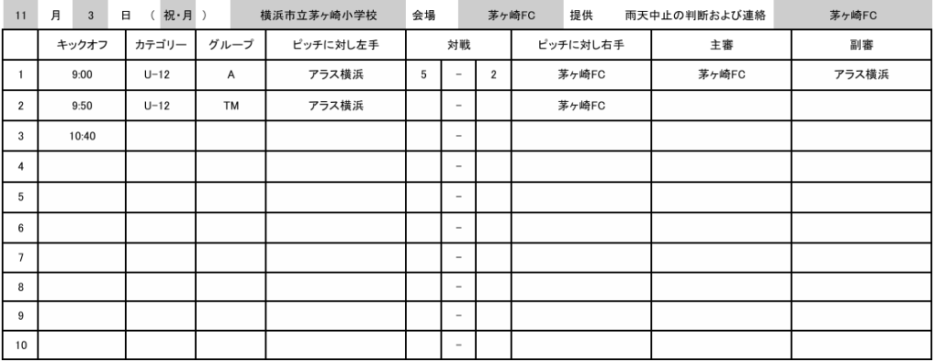 11月3日(祝・月)会場:横浜市立茅ヶ崎小学校 提供:茅ヶ崎FC 雨天中止の判断および連絡:茅ヶ崎FC