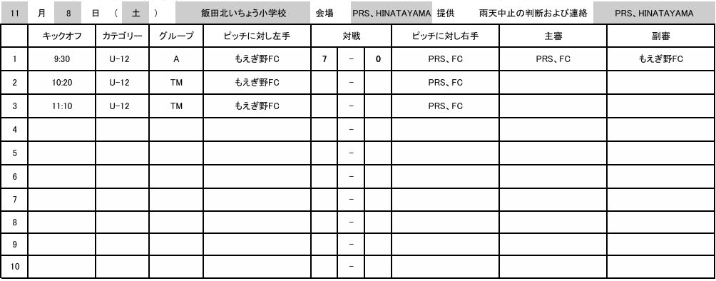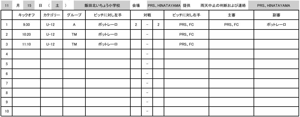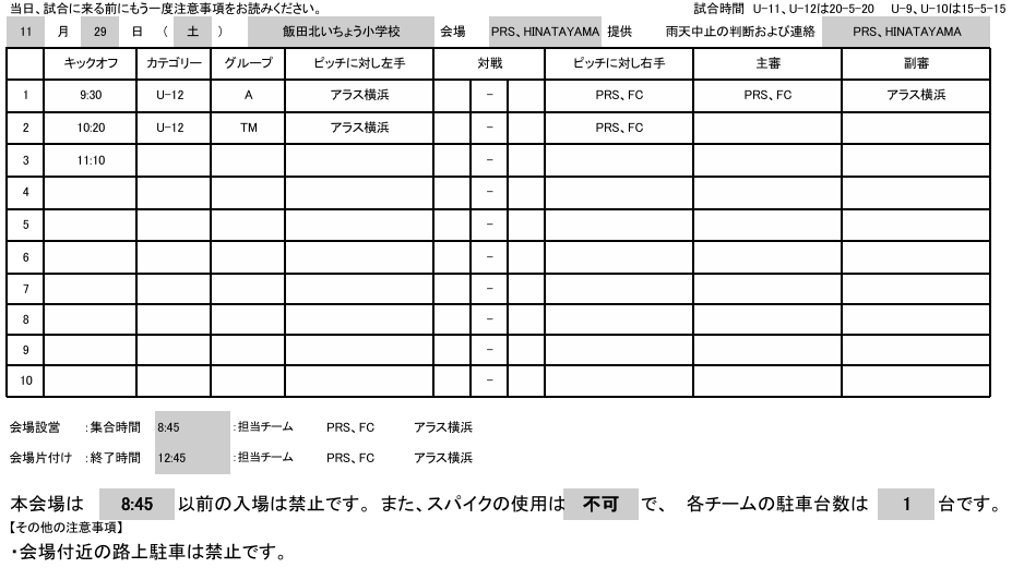 11月8日(土)会場:飯田北いちょう小学校 提供:PRS、FC 雨天中止の判断および連絡:PRS、FC