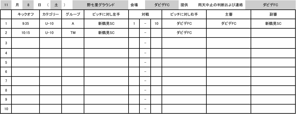 11月9日(日)会場:野七里グラウンド 提供:ダビデFC 雨天中止の判断および連絡:ダビデFC