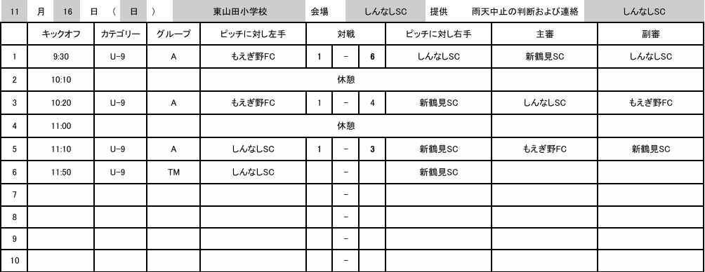 11月16日(日)会場:東山田小学校 提供:しんなしSC 雨天中止の判断および連絡:しんなしSC