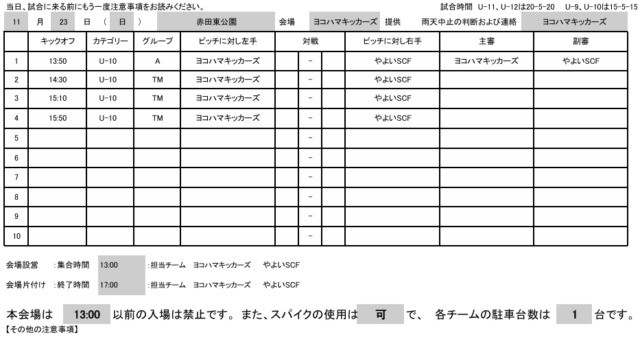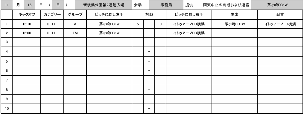 11月2日(日)会場:新横浜公園第2運動広場 提供:事務局 雨天中止の判断および連絡:茅ヶ崎FC