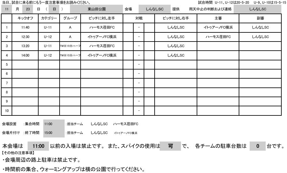 11月23日(日)会場:東山田公園 提供:しんなしSC 雨天中止の判断および連絡:しんなしSC
