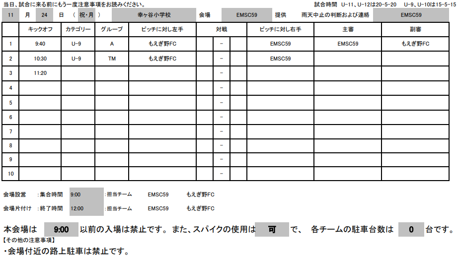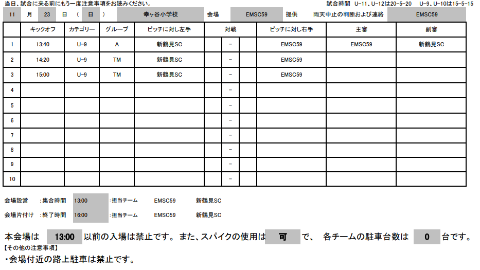11月23日(日)会場:幸ヶ谷小学校 提供:EMSC59 雨天中止の判断および連絡:EMSC59