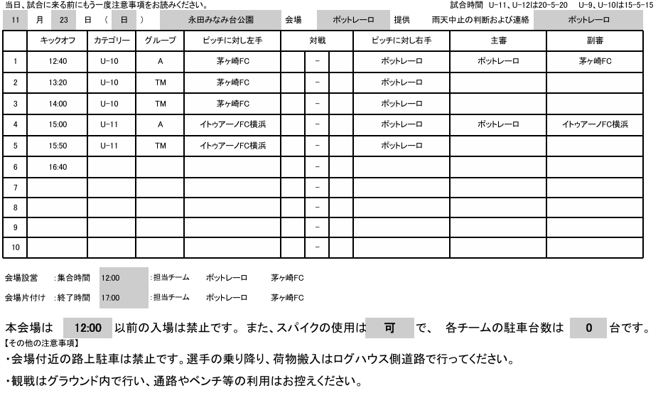 11月23日(日)会場:永田みなみ台公園 提供:ポットレーロFC 雨天中止の判断および連絡:ポットレーロFC