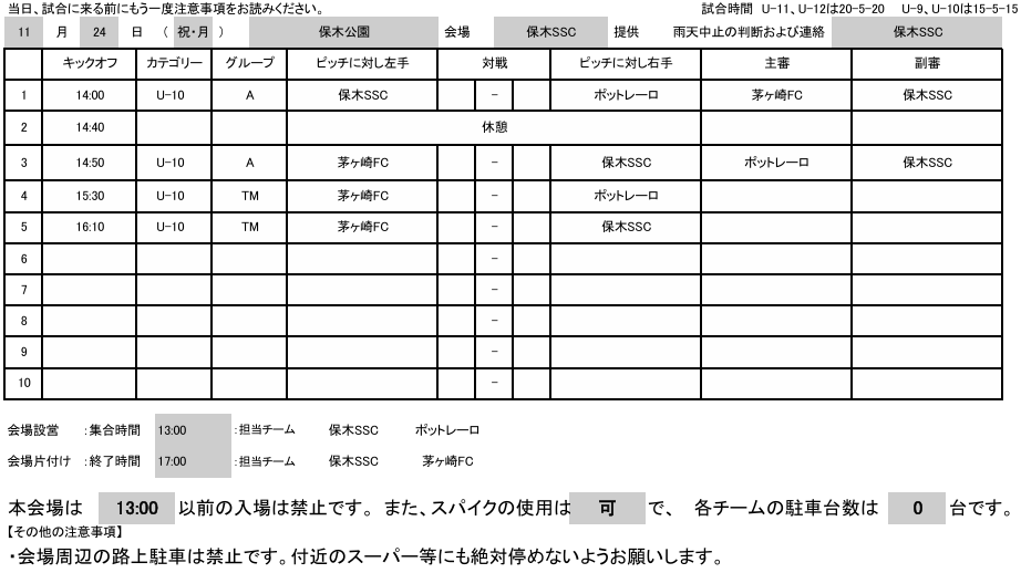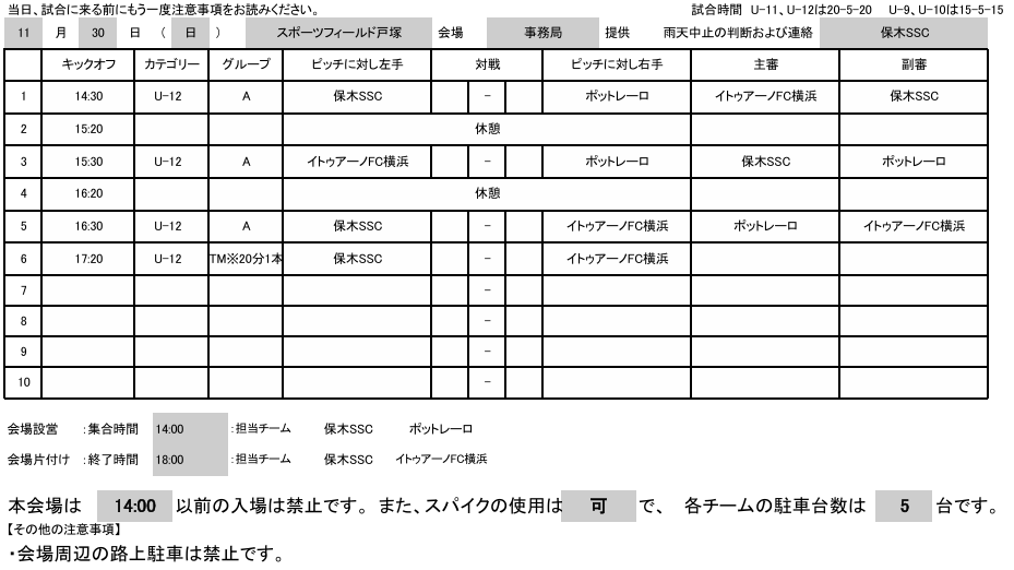 11月9日(日)会場:スポーツフィールド戸塚 提供:事務局 雨天中止の判断および連絡:保木SSC