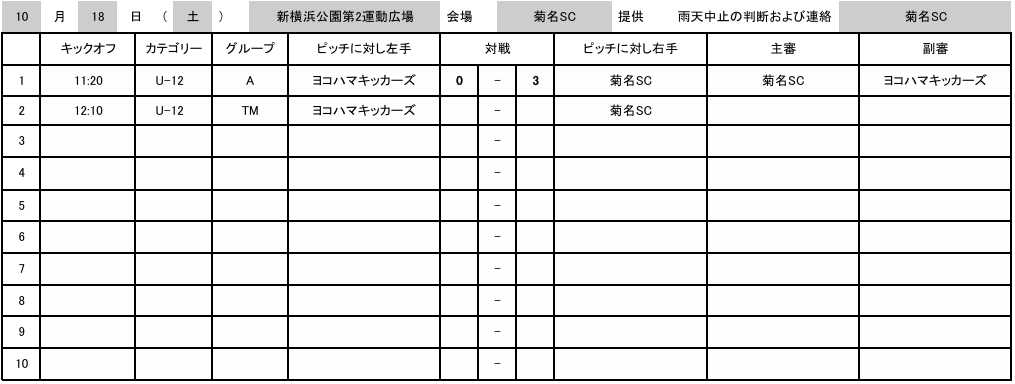 10月18日(土)会場:新横浜公園第2運動広場 提供:菊名SC 雨天中止の判断および連絡:菊名SC