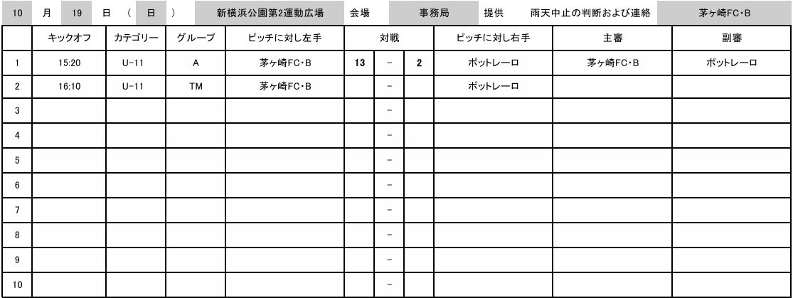 10月19日(日)会場:新横浜公園第2運動広場 提供:事務局 雨天中止の判断および連絡:茅ヶ崎FC
