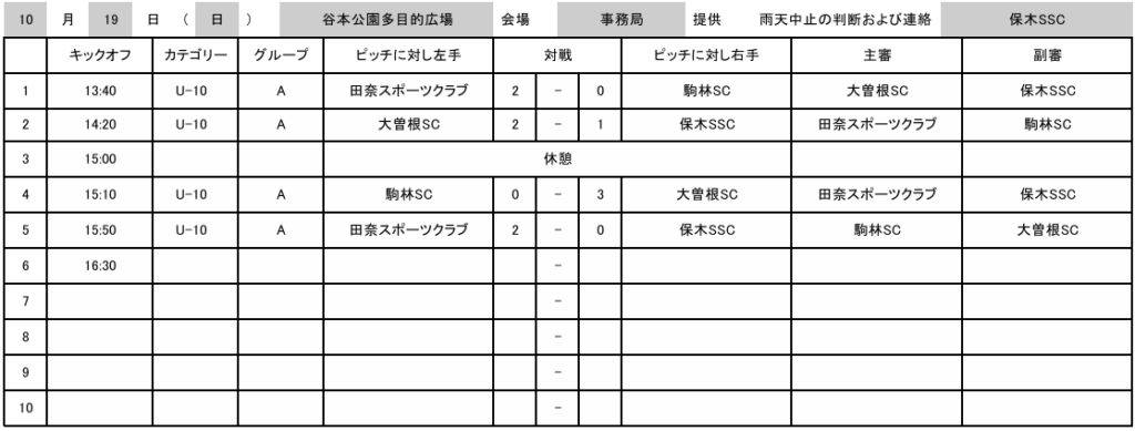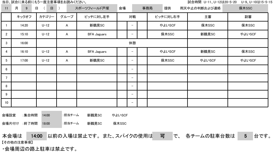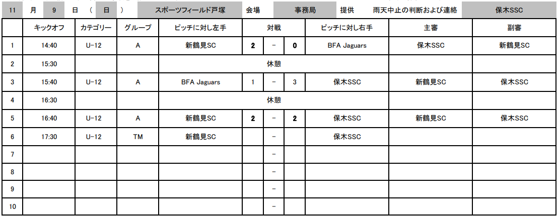 11月9日(日)会場:スポーツフィールド戸塚 提供:事務局 雨天中止の判断および連絡:保木SSC