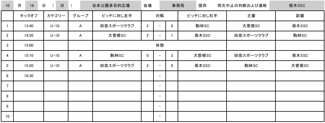 10月19日(日)会場:谷本公園多目的広場 提供:事務局 雨天中止の判断および連絡:保木SSC