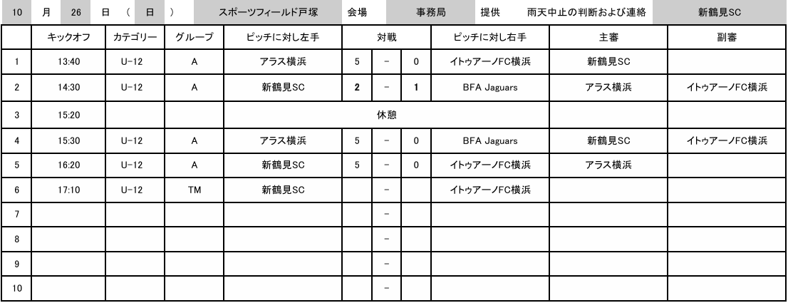 10月26日(日)会場:スポーツフィールド戸塚 提供:事務局 雨天中止の判断および連絡:新鶴見SC