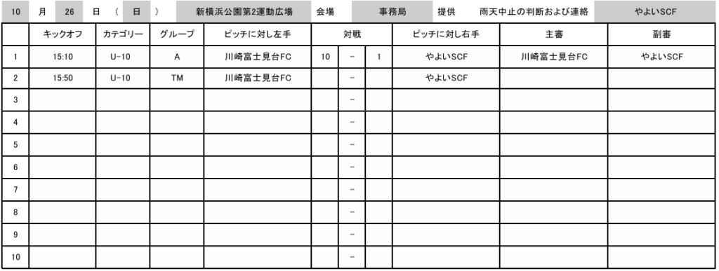 10月26日(日)会場:新横浜公園第2運動広場 提供:事務局 雨天中止の判断および連絡:やよいSCF