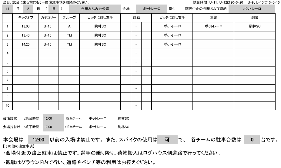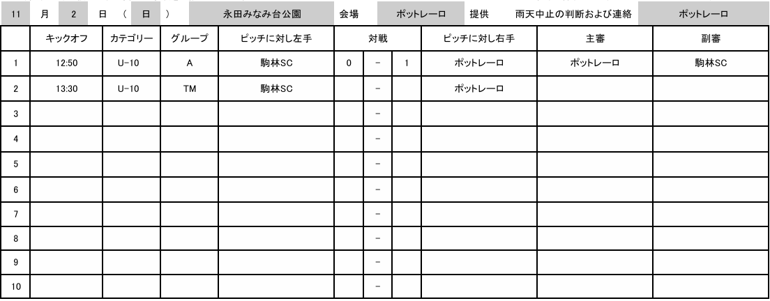 11月2日(日)会場:永田みなみ台公園 提供:ポットレーロFC 雨天中止の判断および連絡:ポットレーロFC