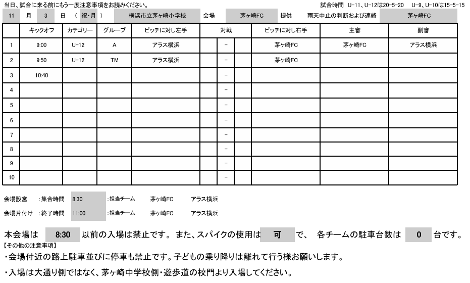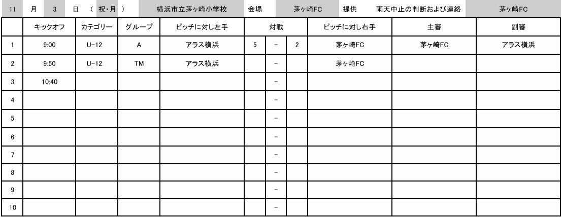 11月3日(祝・月)会場:横浜市立茅ヶ崎小学校 提供:茅ヶ崎FC 雨天中止の判断および連絡:茅ヶ崎FC