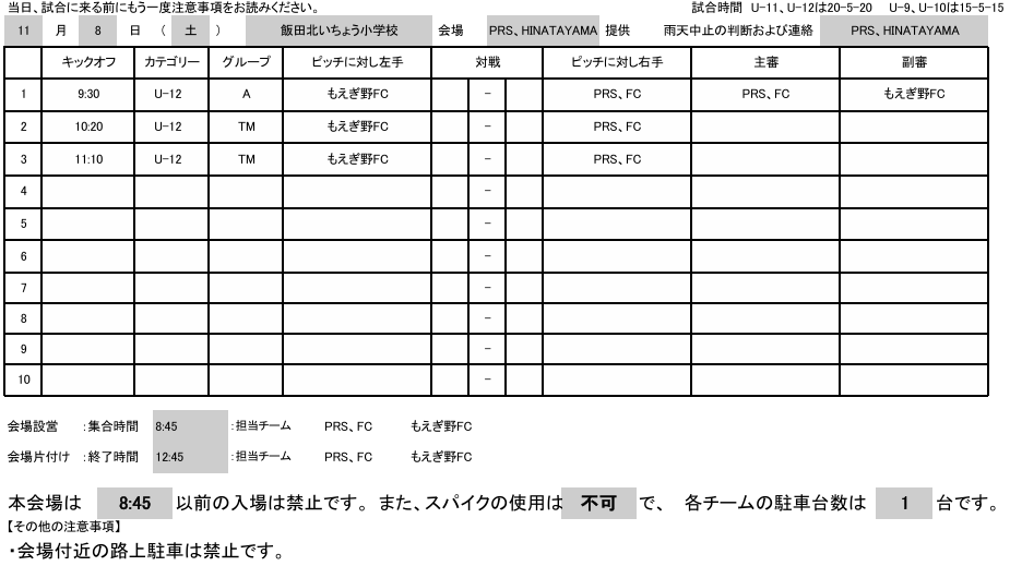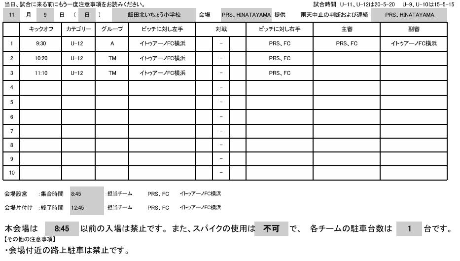 11月9日(日)会場:飯田北いちょう小学校 提供:PRS、FC 雨天中止の判断および連絡:PRS、FC