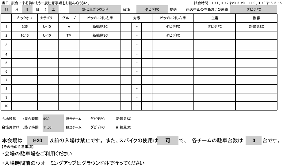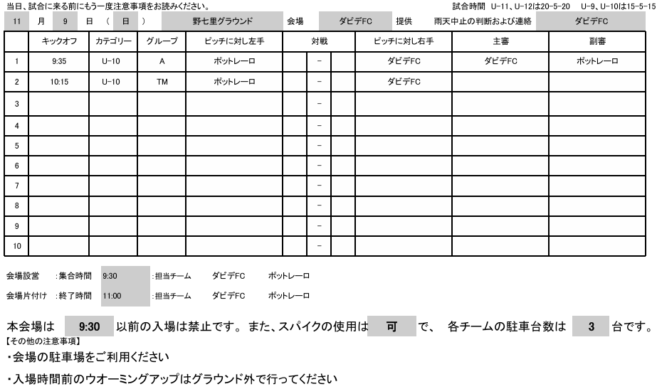 11月9日(日)会場:野七里グラウンド 提供:ダビデFC 雨天中止の判断および連絡:ダビデFC