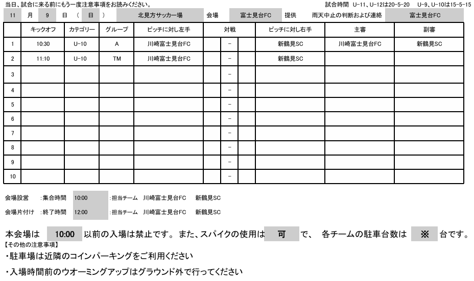 11月9日(日)会場:北見方サッカー場 提供:川崎富士見台FC 雨天中止の判断および連絡:川崎富士見台FC