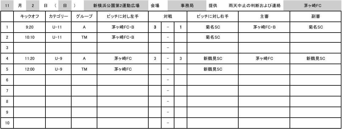 11月2日(日)会場:新横浜公園第2運動広場 提供:事務局 雨天中止の判断および連絡:茅ヶ崎FC